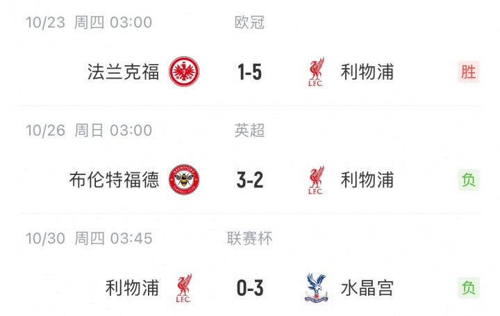在双红会不敌曼联后惠盈财富,赫拉芬贝赫因伤缺席了此后的三场比赛,三场比赛利物浦1胜2负,其中在英超输给布伦特福德,又在联赛杯被水晶宫淘汰。